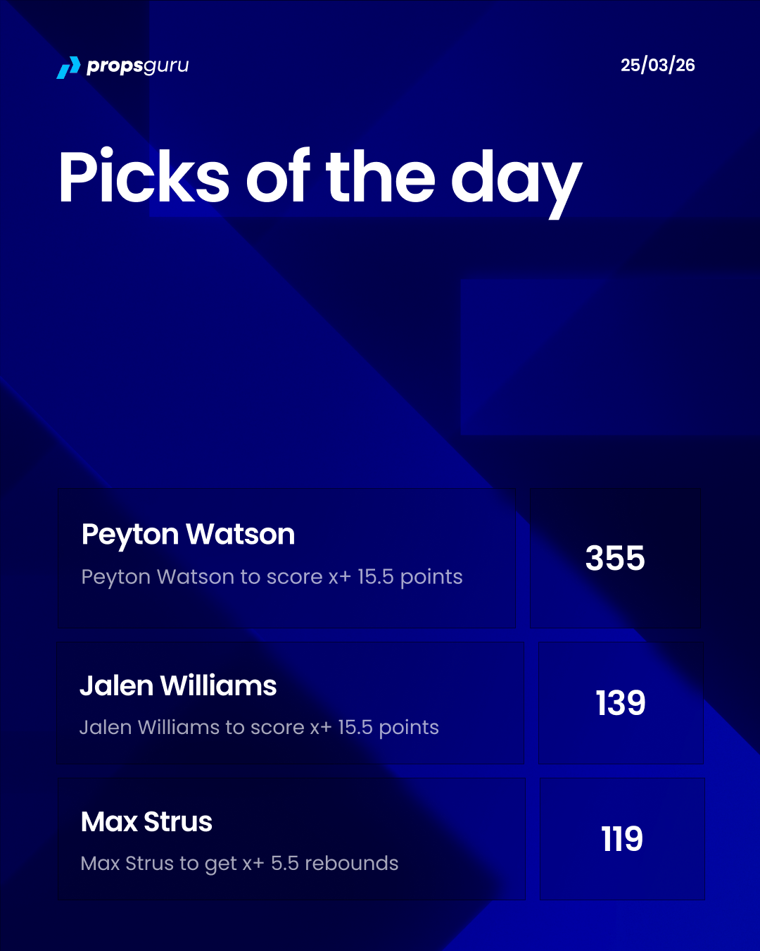 Peyton Watson is very possible of a 16 point game. He’s entering tonight’s match up fresh from an injury, but has been consistently threatening 20 points this year when he’s healthy.