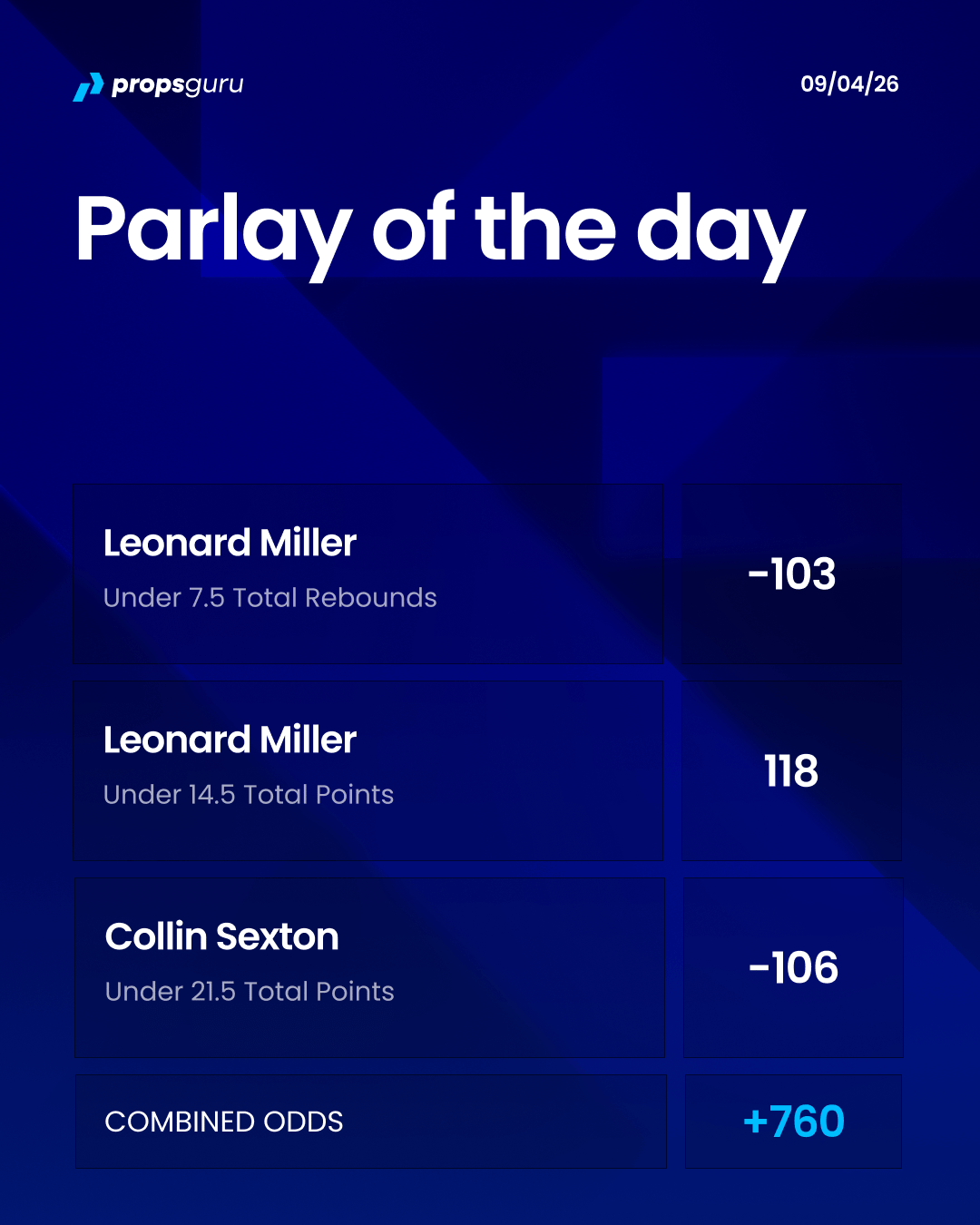 We’ve got a three legged parlay at +760, with a big focus on Leonard Miller.