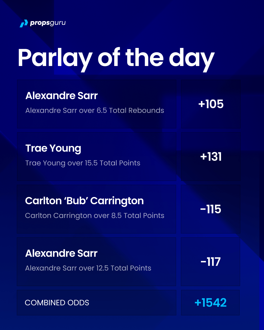 Four legged parlays will never be easy. The lines on Alex Sarr alone require him to have a very strong game. He averages almost 18 points and 7 rebounds. Having both elements of his game come together in the same evening is the tricky part.