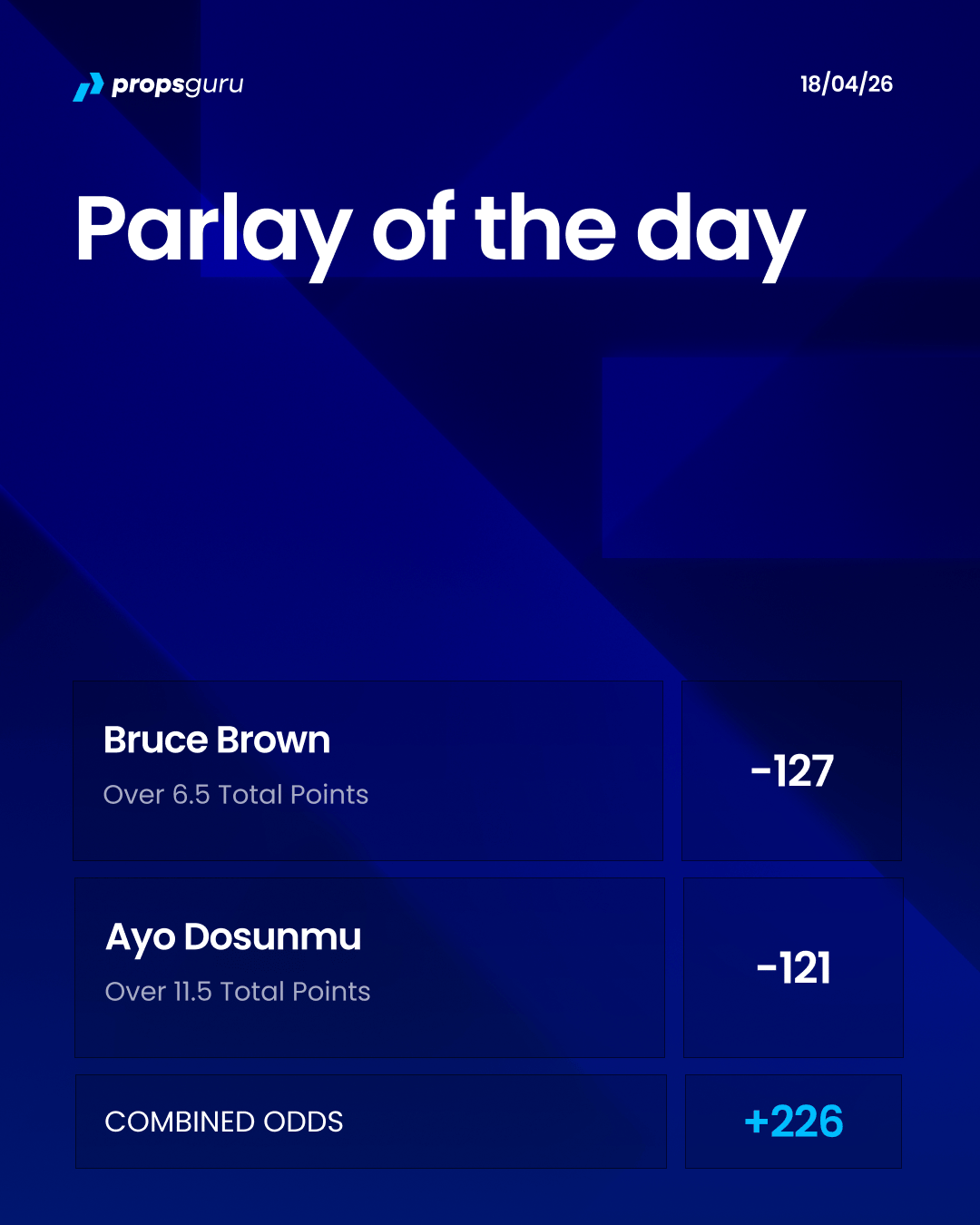 Today we’ve got a two legged parlay at +226. Bruce Brown is a volume dependent scorer who shoots at an efficient 47%. While this parlay depends, in part, on him getting enough looks, it shouldn’t be too hard for Brown to find his way to 7 points. He averages 8 points per game and has only been under 7 in two of his last ten.